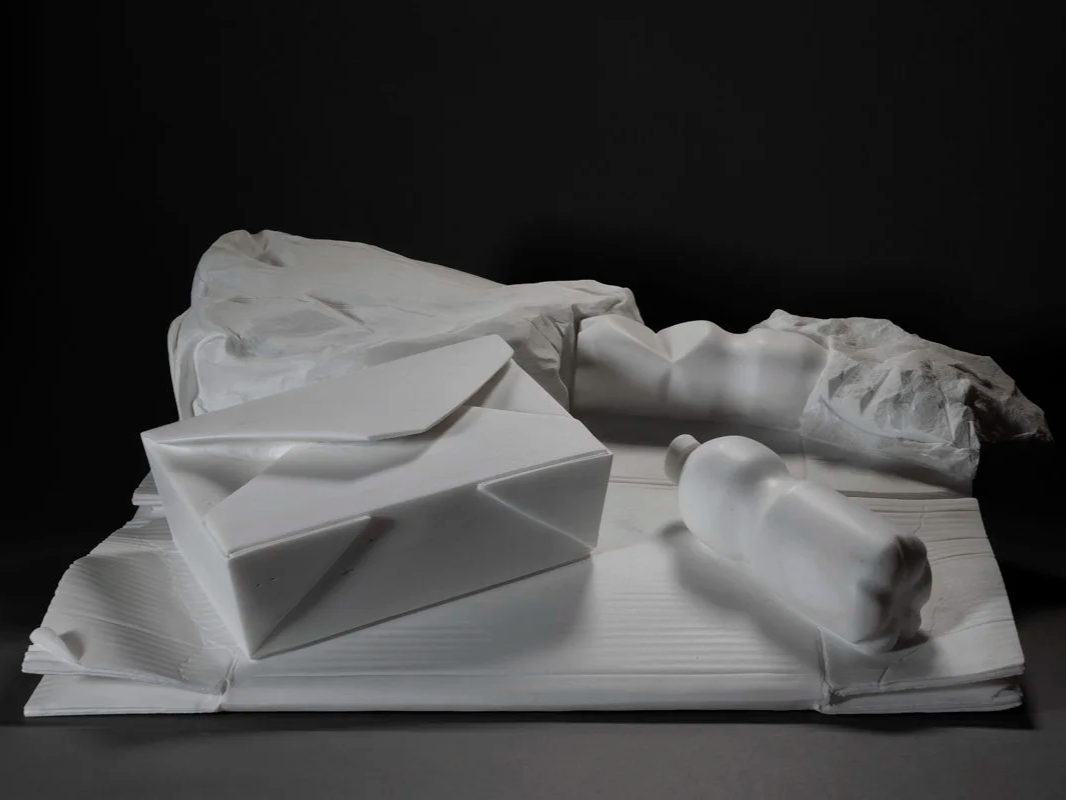 By using your signature style of carving these objects from raw stone, you give a sense of heavy permanence to items that are usually thrown away. The rough, unhewn base of the sculpture serves as the "floor" of the city, grounding the meal in a public, exposed space.